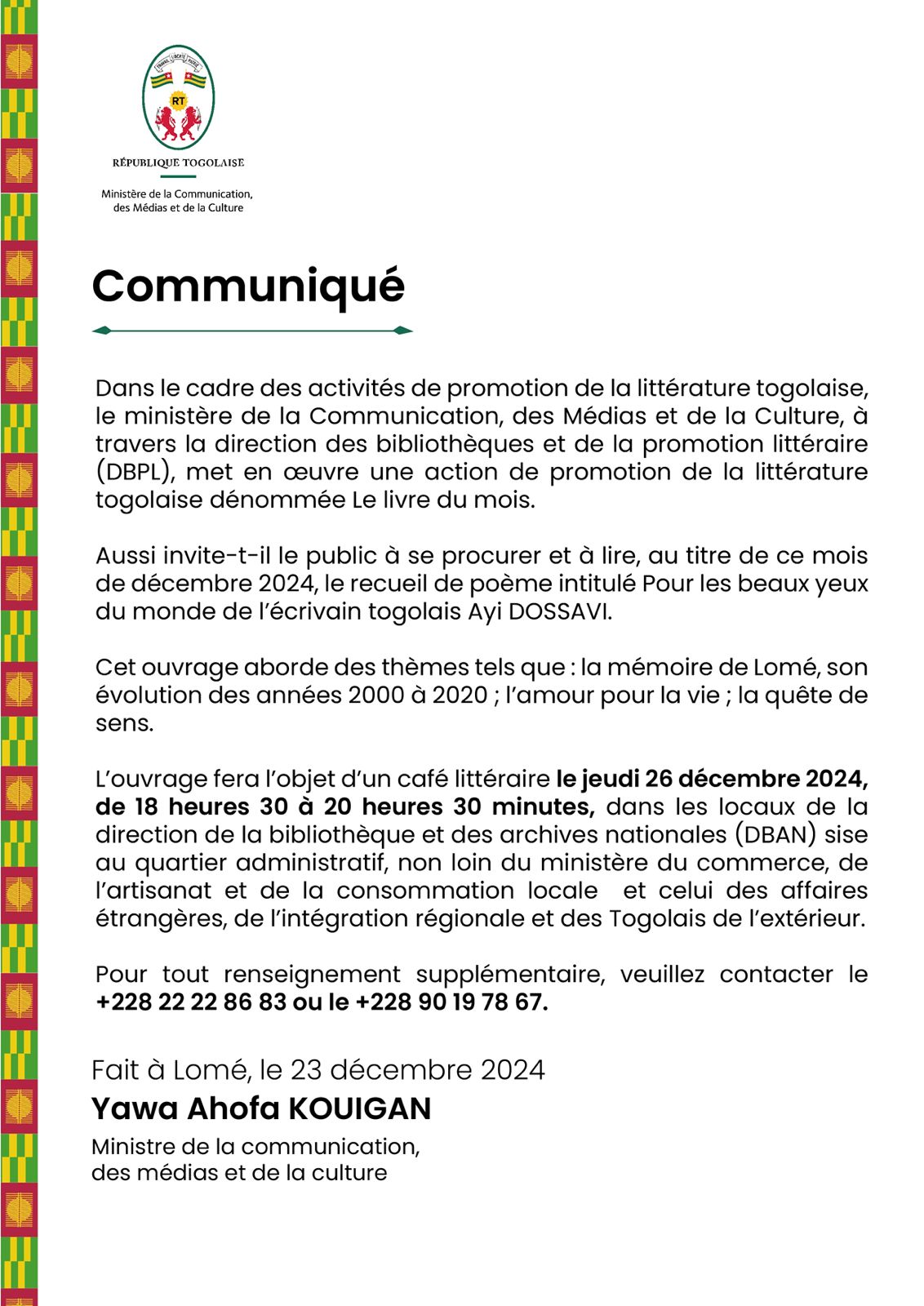 L’ouvrage fera l’objet d’un café littéraire le jeudi 26 décembre 2024, de 18 heures 30 à 20 heures 30 minutes, dans les locaux de la direction de la bibliothèque et des archives nationales (DBAN). Pour tout renseignement supplémentaire, veuillez contacter le + 228 22 22 86 83 ou le +228 90 19 78 67.